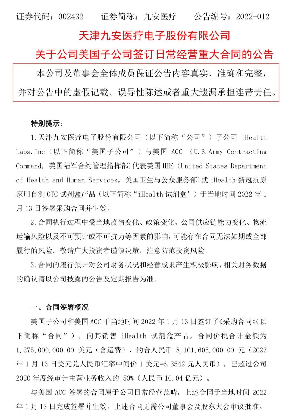 近日,1月14日,九安医疗公告了子公司iHealth与美国陆军合约管理指挥部的一项价值12.75亿美元左右的采购合同。实际上,自2021年12月以来,iHealth与美国官方累计签订的订单金额已达到16亿美元,折合人民币100亿元左右,比九安医疗2020年全年营收高出了5倍。