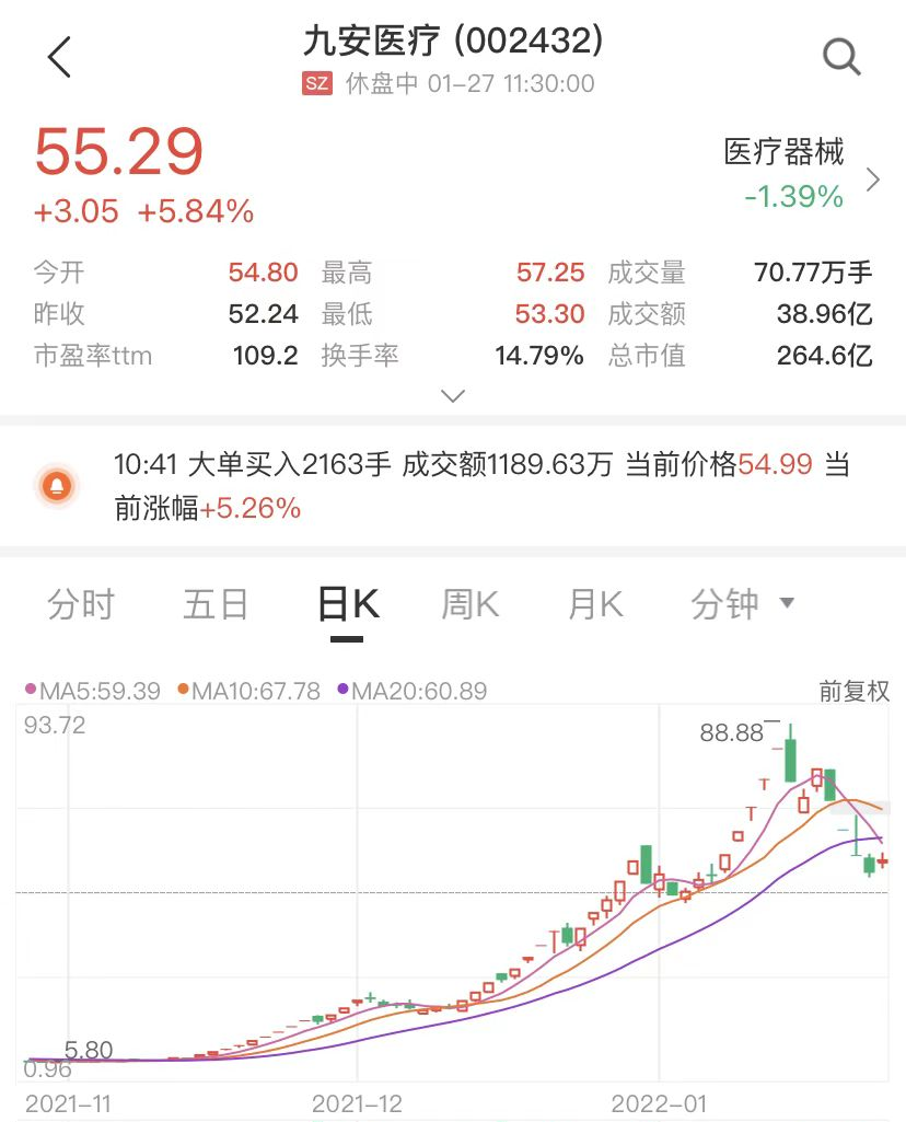 2022年开年之后,公司股价继续大涨,1月11日-1月17日,公司连收五连板。从2021年10月29日最低的5.8元启动,到今年1月18日最高触摸88.88元,九安医疗两个半月的累计涨幅超过14倍。