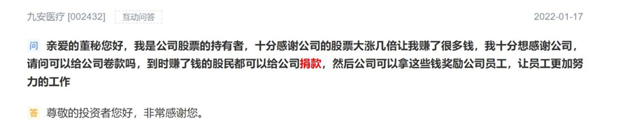 买入九安医疗的股民们也赚得盆满钵满。今年1月17日,在深交所互动易平台上,有股民留言,不仅表达了感谢,还喊着要给该公司捐款。