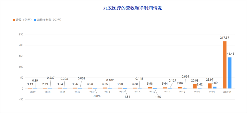 同花顺的数据显示,从2009年—2021年的13年里,九安医疗的总利润也不过才9.8亿,而2022年一季度赚到的钱是过去13年的近15倍。