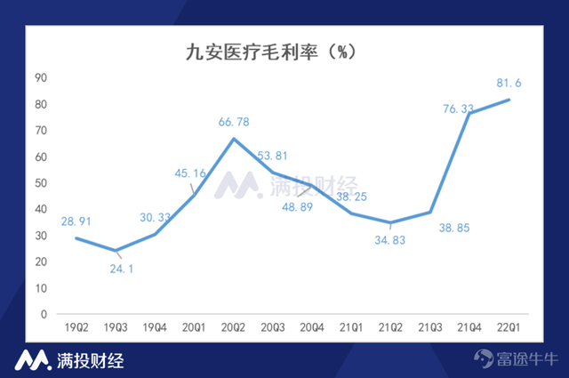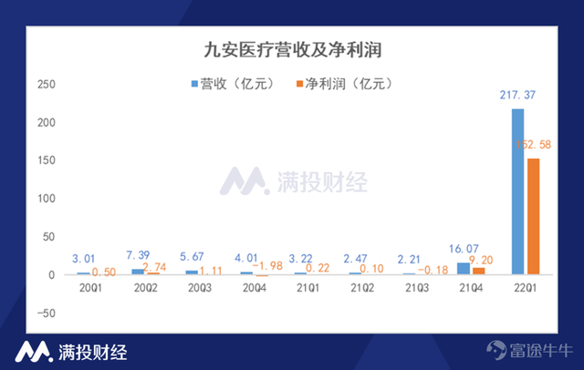 从九安医疗近两年的财务情况来看,可以明显看到九安医疗的业绩在2021年四季度以来的爆发。2022年一季度,九安医疗实现营收217亿元,是2021年一季度的67倍;实现净利润152.58亿元,是2021年一季度的693倍,九安医疗2022年一季度的利润比前12年的净利润总和还要多,可以说是一飞冲天。