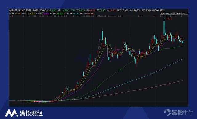 由于业绩的兑现,九安医疗在二级市场的表现高歌猛进,2021年11月份以来,九安医疗的股价从6月涨到最高99元,截至2022年5月13日报收64.95元,涨跌幅超1000%,远远超过行业平均的-17.45%。公司的市值从30亿飙升至380亿仅花了5个月的时间,是2022年最牛的跨年妖股。