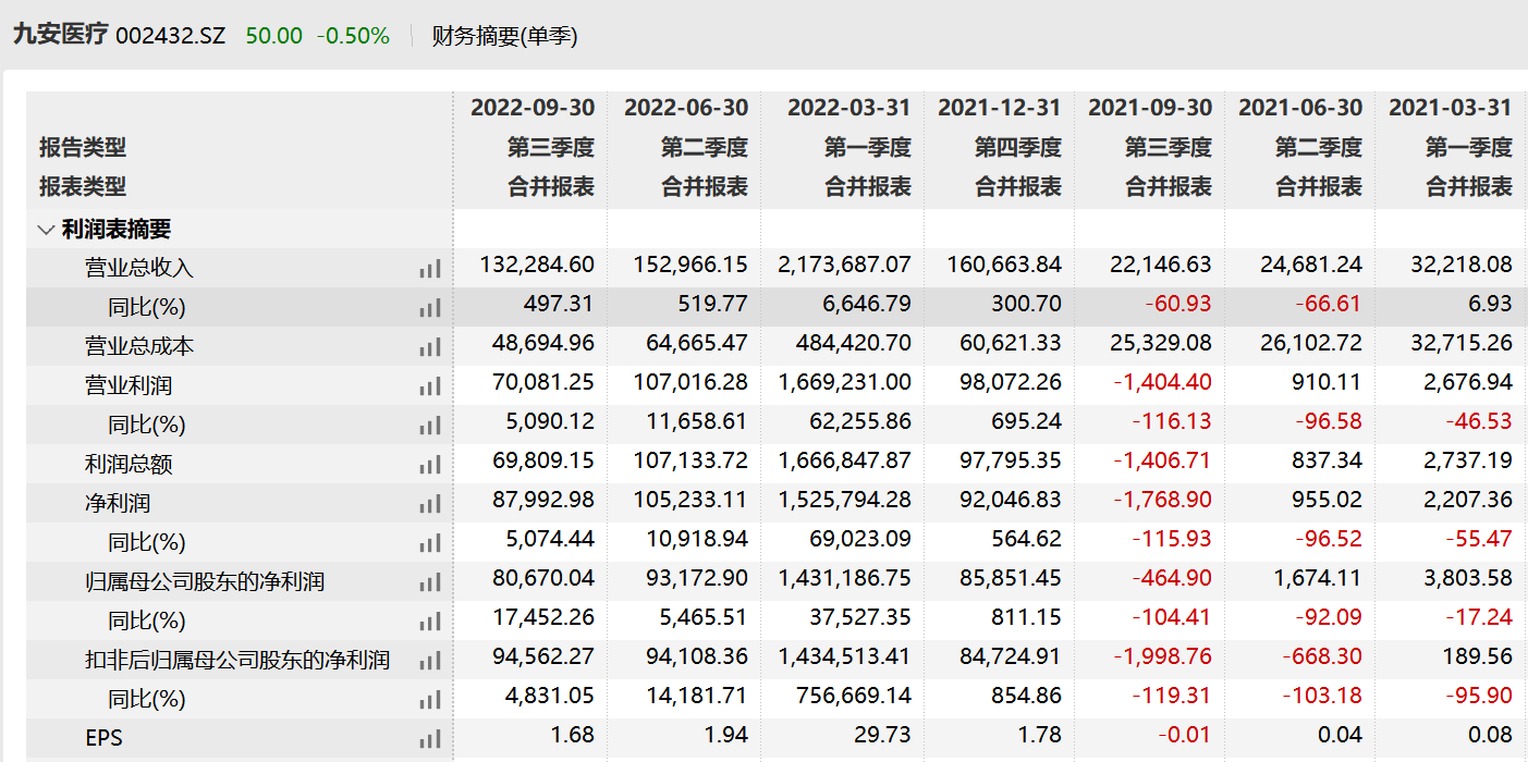 依据2022年三季报,九安医疗在2022年前三季度实现归母净利润160.50亿元。按此计算,在2022年第四季度,九安医疗仅实现归母净利润4.5亿元至14.5亿元。Wind数据显示,相比2021年第四季度的8.59亿元,九安医疗2022年四季度归母净利润同比变动在-47.61%至68.8%之间。