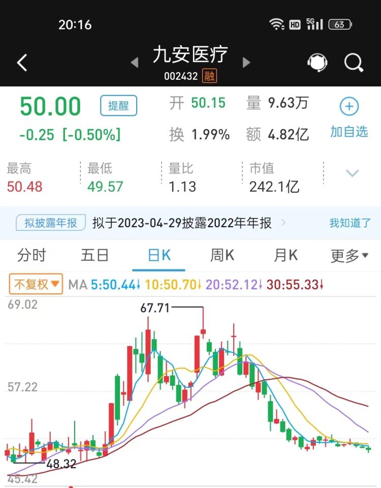 二级市场上,九安医疗1月19日报收于50元,跌0.50%,公司目前总市值为242.1亿元。
