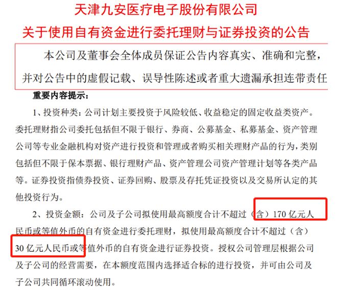壕无人性,主营海外检测试剂的九安医疗将斥资200亿元炒股和理财,其中,170亿元进行委托理财,30 亿元进行证券投资,如此大手笔投资引发市场热议。