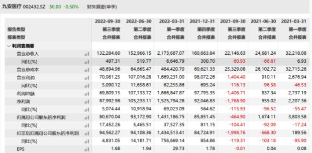 不仅如此,Wind数据显示,九安医疗去年第二和第三季度的净利润增速,环比也均出现降低,其中,九安医疗归母净利润在2022年第二季度环比减少93.49%,在第三季度环比减少13.42%。