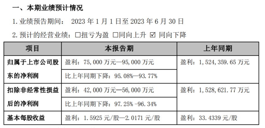 7月14日,天津九安医疗电子股份有限公司(九安医疗,002432)发布2023年上半年业绩预告,预计上半年净利润7.5亿元至9.5亿元,较去年同期的152.44亿元下降93.77%至95.08%;扣非净利润4.2亿元至5.6亿元,较去年152.86亿元下降97.25%至96.34%。
