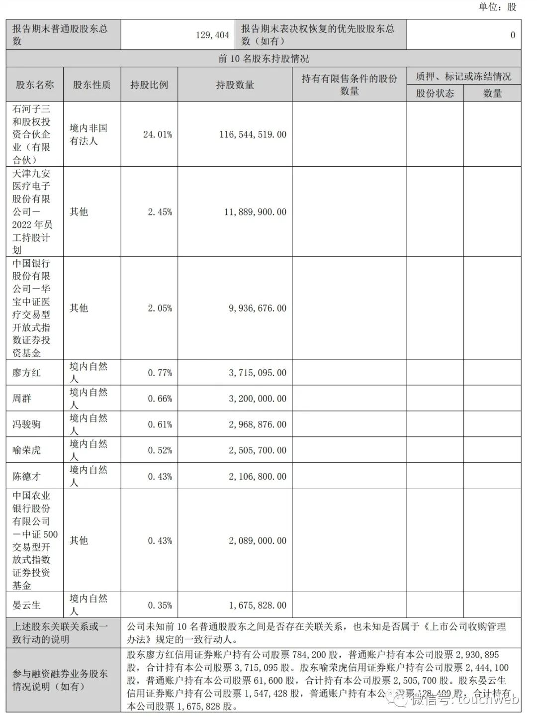截至2023年6月30日,刘毅通过石河子三和股权投资合伙企业(有限合伙)持股为24.01%,天津九安医疗电子股份有限公司-2022年员工持股计划持股为2.45%,中国银行股份有限公司-华宝中证医疗交易型开放式指数证券投资基金持股为2.05%;