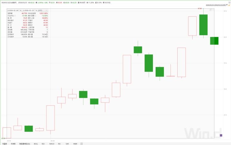 据Wind数据统计,仅2026年2月24日—3月23日这20个交易日,九安医疗的股价大幅上涨46.79%,与同期公司所处行业指数下跌9.18%形成鲜明对比。