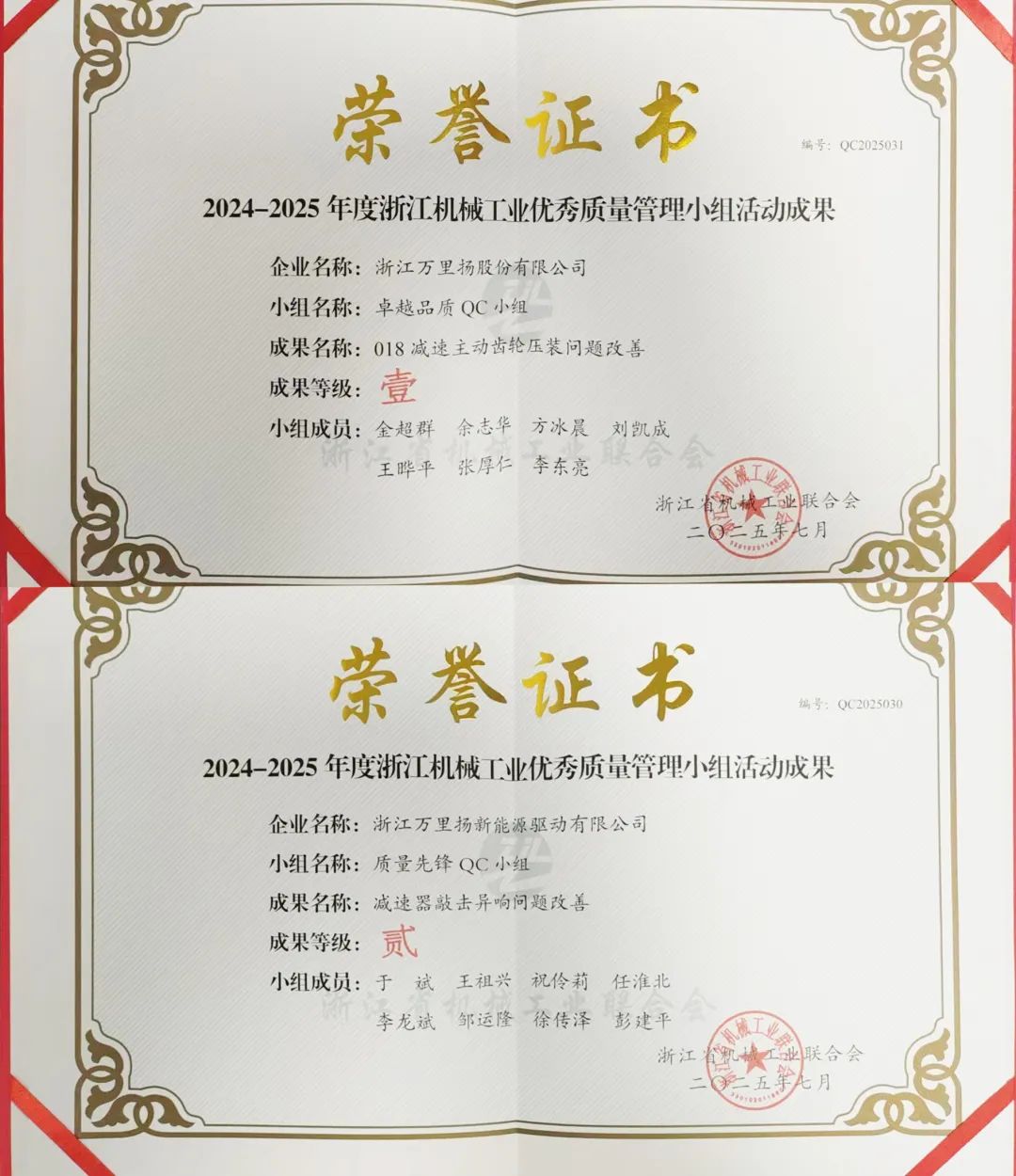 近日,由浙江省机械工业联合会主办的“2024-2025年度浙江省机械工业群众性质量管理活动成果交流学习会”在嘉兴举行,万里扬选送的QC成果表现优异,斩获一等奖1项、二等奖1项。