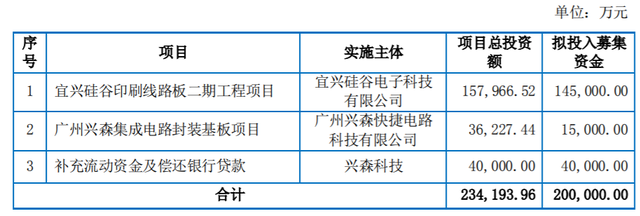 公司本次发行募集资金扣除发行费用后,计划14.5亿元用于宜兴硅谷印刷线路板二期工程项目,1.5亿元用于广州兴森集成电路封装基板项目,4亿元用于补充流动资金及偿还银行贷款。
