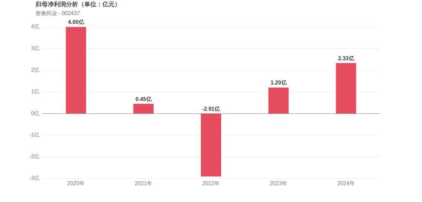 利润角度分析,2020年誉衡药业实现归母净利润4.00亿元,2024年2.33亿元。利润表现波动明显,呈现大幅震荡态势。