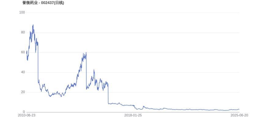 2015年6月3日,誉衡药业的市值巅峰达到331.69亿元,股价也顺应升至45.32元。而至6月20日收盘,誉衡药业的股价为2.8元,市值为62.88亿元,相比峰值时期市值减少268.81亿元,市值蒸发了81.04%。