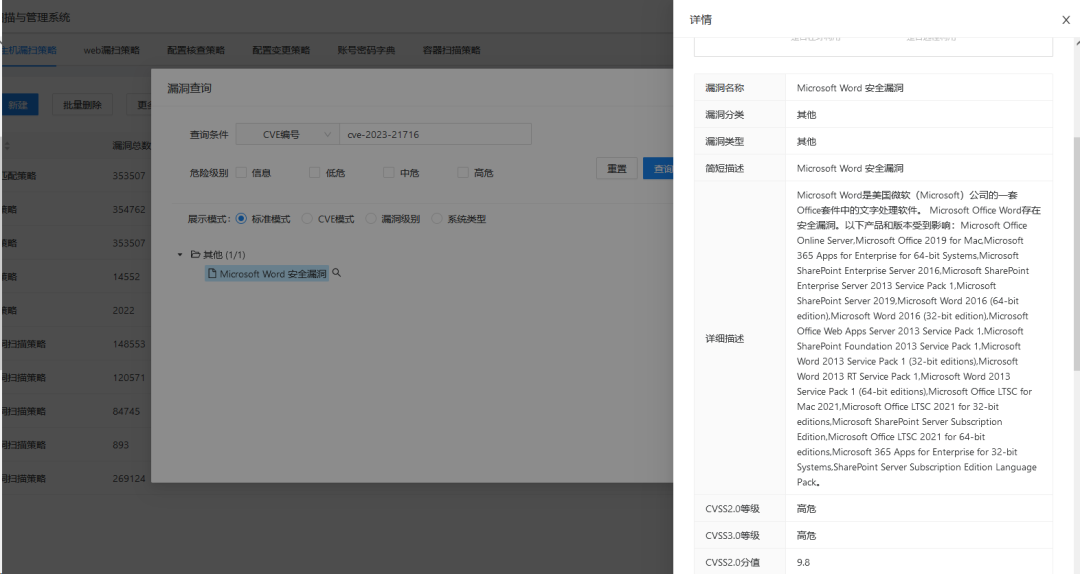 启明星辰资产与脆弱性管理平台实时采集并更新情报信息,对入库资产漏洞Microsoft Word远程代码执行漏洞(CVE-2023-21716)进行管理,如图所示: