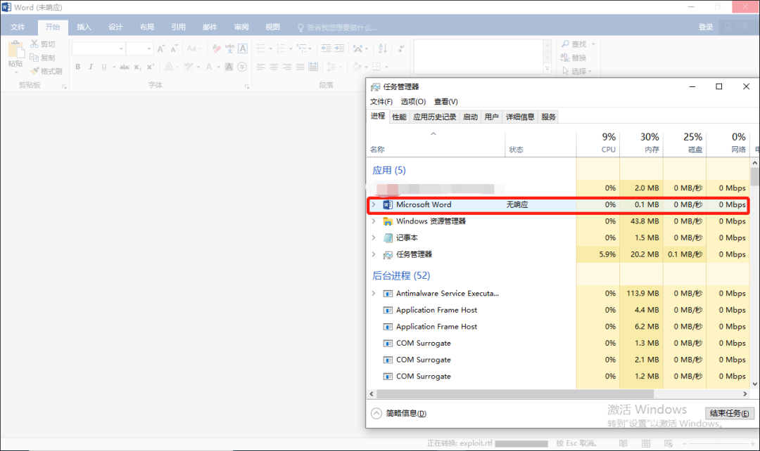 然后word进程出现未响应,随后进程崩溃退出。