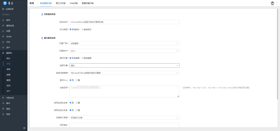 1)在泰合的平台中,通过脆弱性发现功能针对“Microsoft Word远程代码执行漏洞(CVE-2023-21716)”执行漏洞扫描任务,排查管理网络中受此漏洞影响的重要资产;