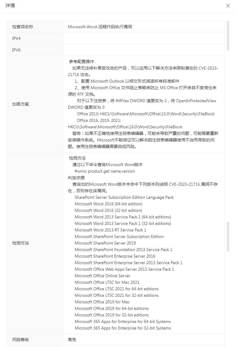 通过启明星辰天镜脆弱性扫描与管理系统-配置核查模块对该漏洞影响的 Microsoft Word 版本进行获取,使用智能化分析研判机制确认该漏洞是否存在,如果存在该漏洞可通过安全配置加固来降低被攻击风险。