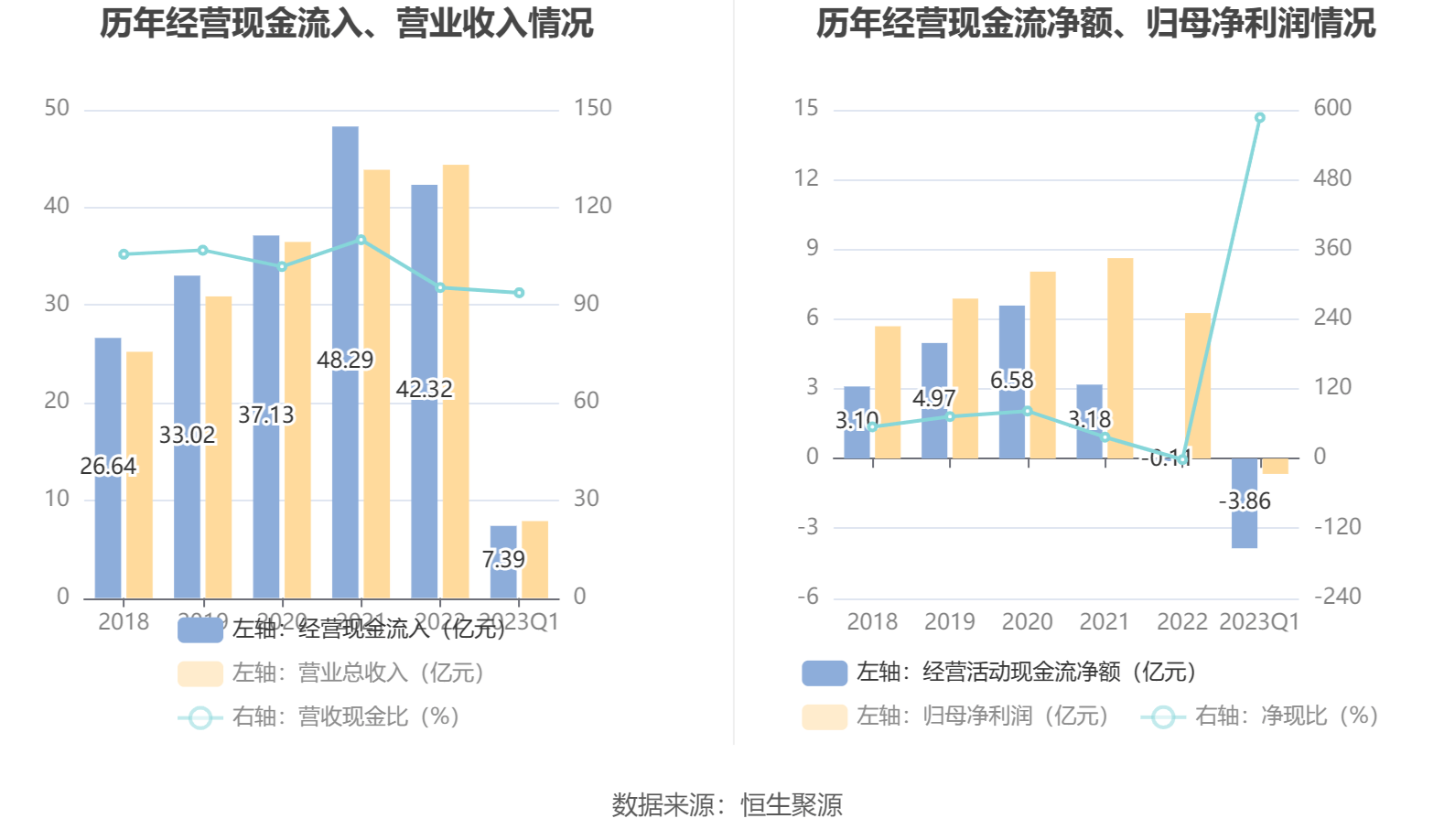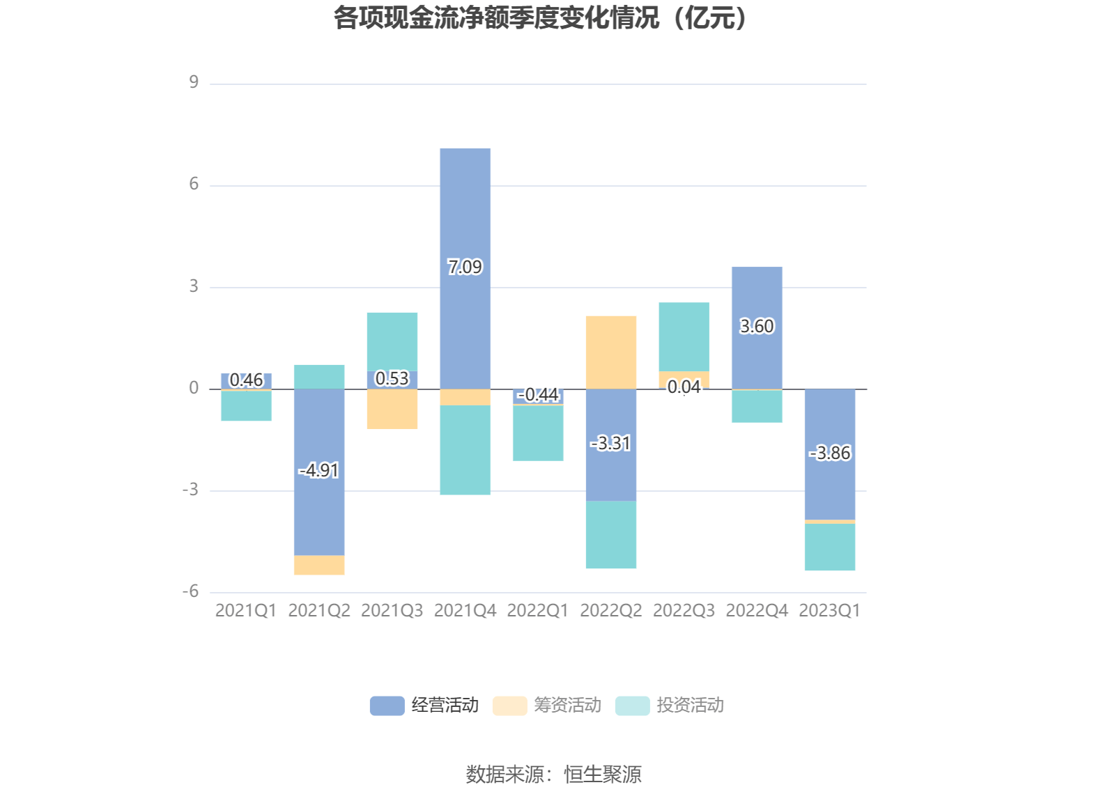 截至2023年一季度末,公司经营活动现金流净额为-3.86亿元,同比减少3.42亿元,环比下降7.46亿元;筹资活动现金流净额-1129.81万元,较上年一季度末下降588.46万元;投资活动现金流净额-1.38亿元,上年同期为-1.63亿元。