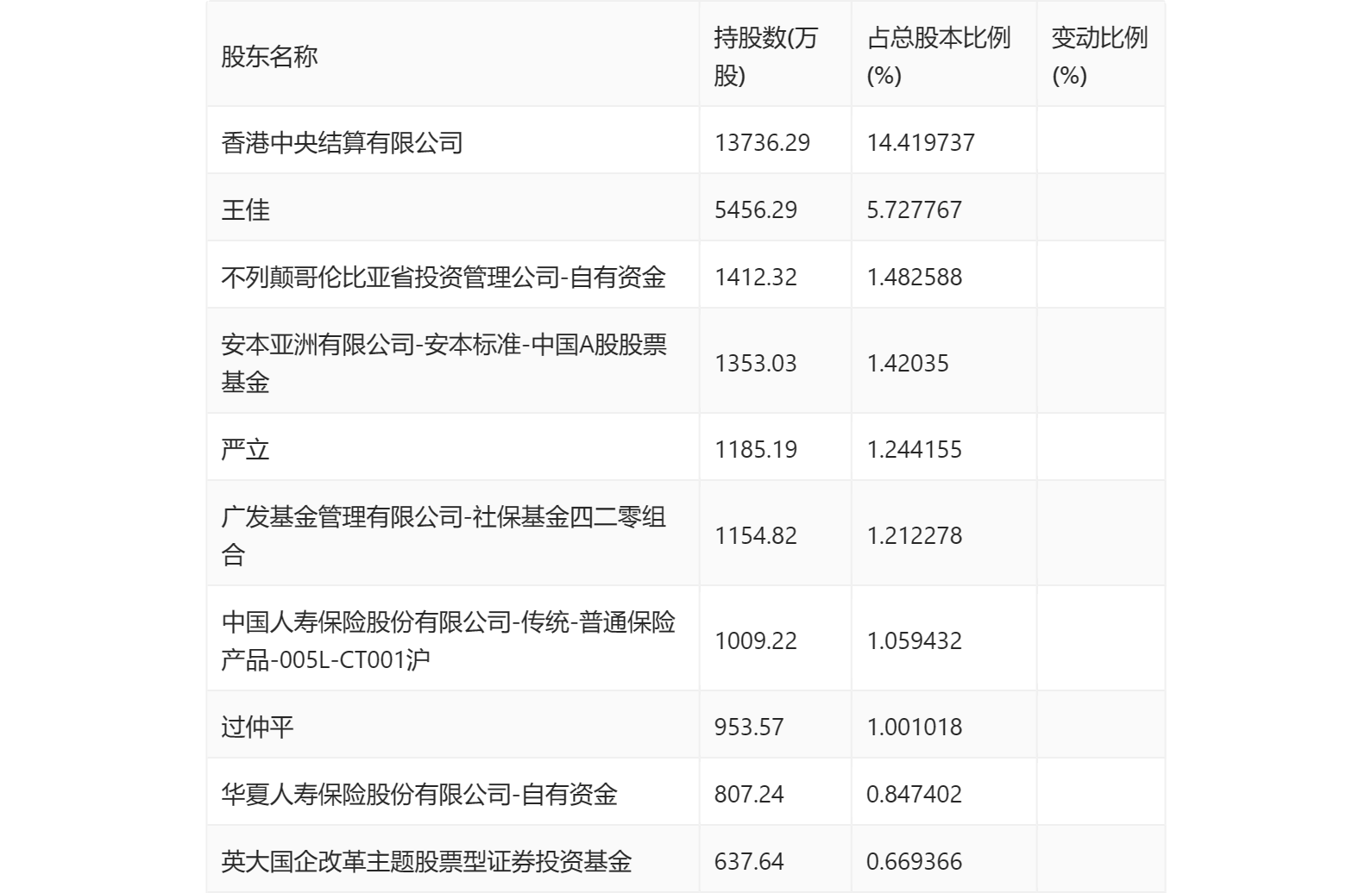 2023年一季度末的公司十大流通股东中,新进股东为安本亚洲有限公司-安本标准-中国A股股票基金、中国人寿保险股份有限公司-传统-普通保险产品-005L-CT001沪、华夏人寿保险股份有限公司-自有资金、英大国企改革主题股票型证券投资基金,取代了此前的挪威中央银行-自有资金、安本标准投资管理(亚洲)有限公司-安本标准-中国A股股票基金、荷宝基金管理公司-荷宝资本成长基金、瑞典第二国家养老基金-自有资金。在具体持股比例上,香港中央结算有限公司、不列颠哥伦比亚省投资管理公司-自有资金、广发基金管理有限公司-社保基金四二零组合持股有所上升,过仲平持股有所下降。