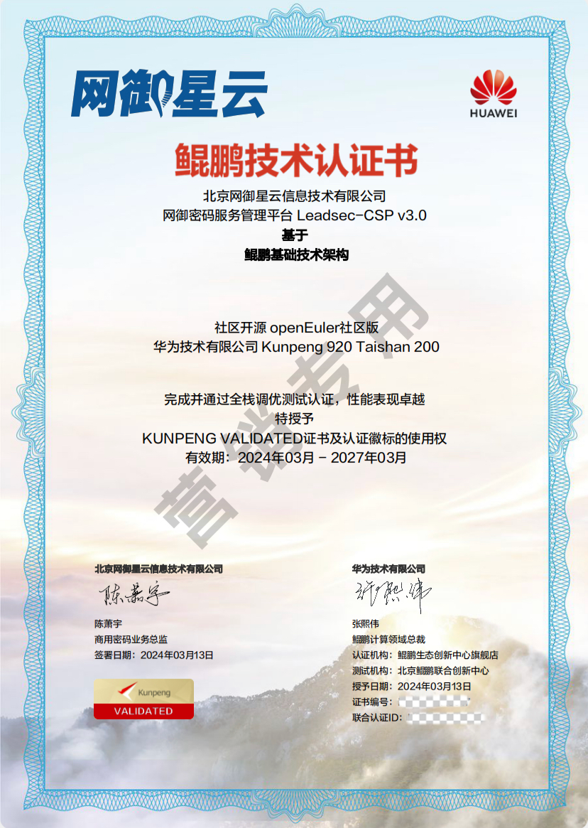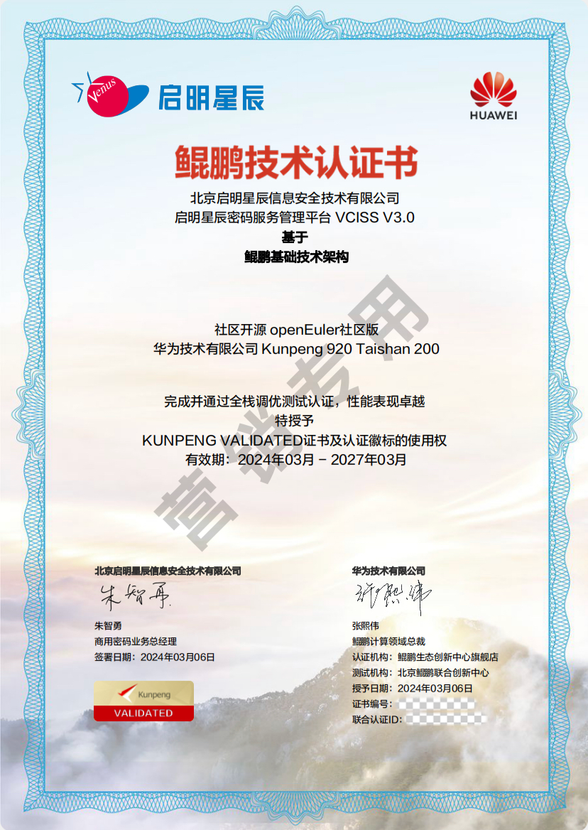 近日,启明星辰集团旗下全资子公司北京启明星辰和网御星云的密码服务管理平台,基于鲲鹏基础技术架构双双完成并通过全栈调优测试认证,获得华为鲲鹏Validated认证。