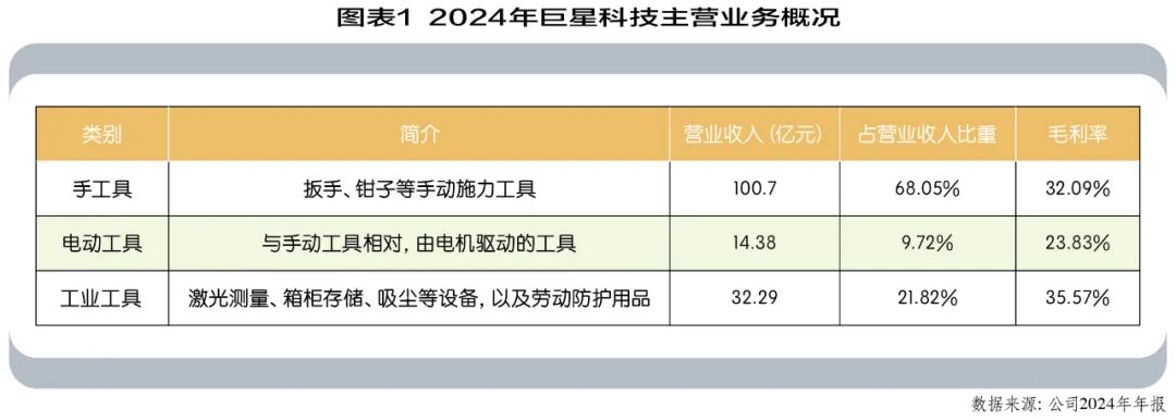 如图表1所示,2024年 巨星科技 三大核心业务板块合计收入147.37亿元,其中,手工具业务收入100.7亿元,同比增长40.46%,占总营业收入比重为68.05%,是公司第一大核心业务,全球市占率达到6%以上,位列第二;电动工具业务收入14.38亿元,同比增长36.53%,全球市占率约0.5%,有较大成长空间;工业工具业务收入32.29亿元,同比增长22.14%,毛利率为35.57%。
