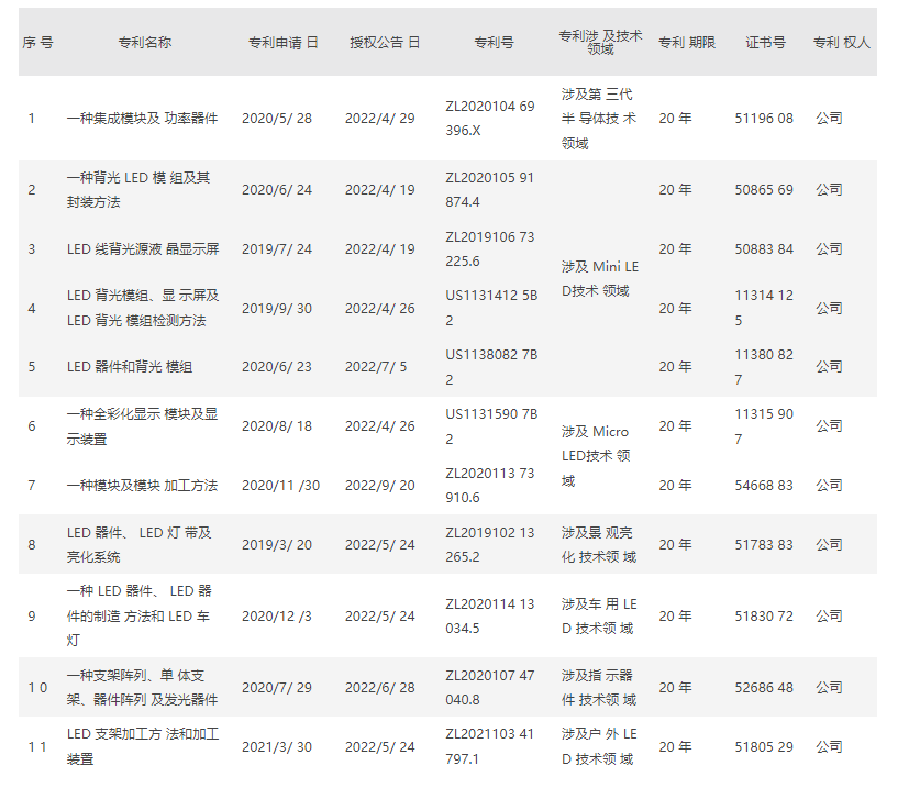 2023年1月10日,国星光电(002449.SZ)关于公司取得11项发明专利证书的公告,佛山市国星光电股份有限公司(以下简称“公司”)于近日收到11项发明专利证书,其中中国相关部门颁发的发明专利证书8项、美国发明专利证书3项,具体情况如下:
