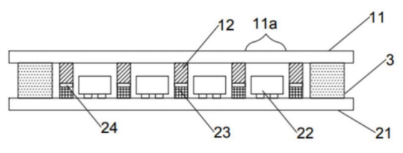 而光源面板包括驱动基板21、芯片阵列22、支撑墙23和缓冲贴合层24。驱动基板21设有连接电路和若干个对位标记点,正面与封装盖板11的正面相对设置且两个基板上的对位标记点相互对位。芯片阵列22包括多个微型发光二极管芯片,并设置在驱动基板21的正面与驱动电路电性连接,其中每个芯片所发出的光可分别通过一个透光区11a出射。在驱动基板21的上方设有支撑墙23,位置与挡墙12在驱动基板21上的正投影重合,从而可以对所述挡墙12形成支撑。其中支撑墙与挡墙的高度之和应大于等于芯片的高度,当支撑墙的数量多于一个时,各支撑墙的高度一致。