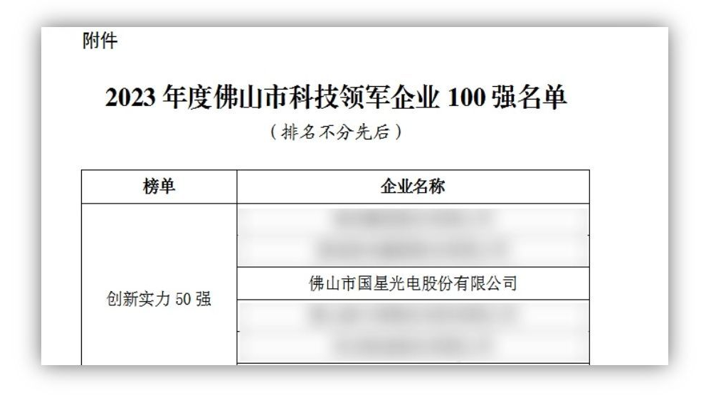 近日,佛山市科学技术局正式公布了“2023年度佛山市科技领军企业100强名单”,国星光电成功上榜百强名单“创新实力50强”,出色的创新能力及过硬的综合实力获得充分肯定。
