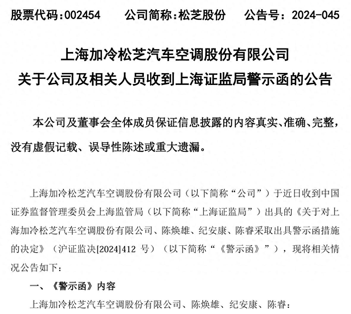 12月24日晚间,松芝股份(002454)披露公告称,公司于近日收到上海证监局出具的《关于对上海加冷松芝汽车空调股份有限公司、陈焕雄、纪安康、陈睿采取出具警示函措施的决定》。