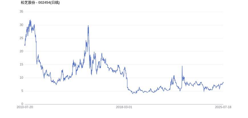 2015年06月05日,松芝股份的市值巅峰达到125.53亿元,股价也顺应升至30.95元。而至07月18日收盘,松芝股份的股价为8.27元,市值为51.98亿元,相比峰值时期市值减少73.55亿元,市值蒸发了58.59%。