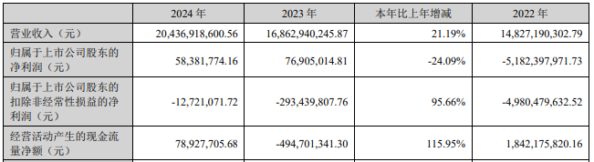 2024年,公司营业收入实现204.37亿元,同比增长21.19%;归属于上市公司股东的净利润0.58亿元,同比减少24.09%,2023年为0.77亿元,2022年为-51.82亿元;归属于母公司所有者的扣除非经常性损益的净利润-0.13亿元,2023年为-2.93亿元,2022年为-49.80亿元;经营活动产生的现金流量净额0.79亿元,同比增长115.95%。