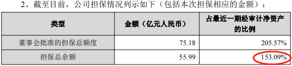 截至目前,公司董事会批准的担保总额度为75.18亿元,占最近一期经审计净资产的比例的205.57%;担保总余额为55.99亿元,占最近一期经审计净资产的比例的153.09%。
