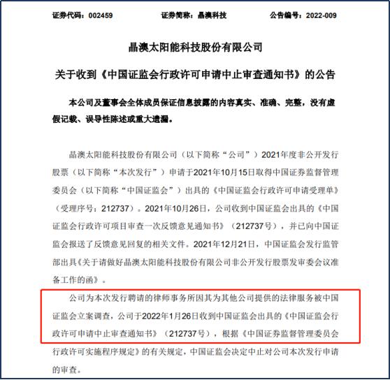 晶澳科技1月26日晚间公告称,证监会决定中止对公司2021年度非公开发行股票申请的审查,原因是公司为此次发行聘请的律师事务所(北京市金杜律师事务所)因其为其他公司提供的法律服务被证监会立案调查。