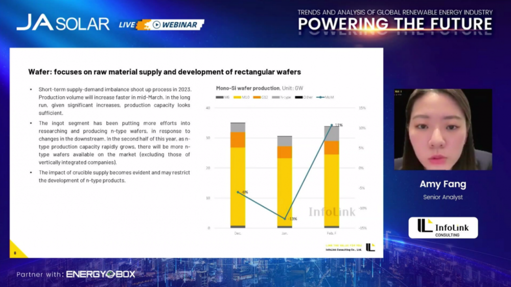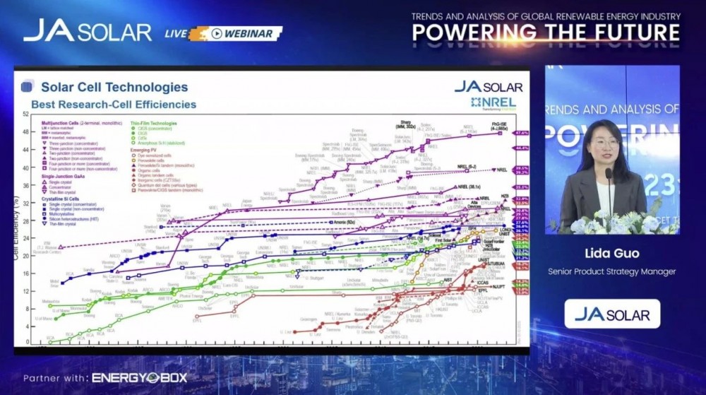 之后,晶澳科技产品战略高级经理郭逦达作“光伏技术创新趋势解码:太阳能电池和组件”报告。她介绍,在未来两年内,p-PERC组件将成为主流产品,而在未来,n型组件可能会成为单晶PERC之后的主导产品之一。她还介绍了晶澳科技组件核心产品的先进技术,包括从2020年的DeepBlue 3.0到2022年的DeepBlue 4.0 X,并补充说晶澳将在2023年推出新产品。此外,她强调了DeepBlue 4.0 X的主要特点和优点——可以为住宅和工商业、和大型地面电站等多个领域提供更低LCOE的解决方案。