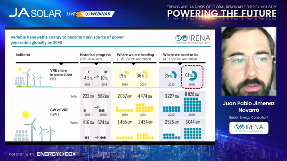 国际可再生能源署(IRENA)的高级能源顾问Juan Pablo Jimenez Navarro指出,2050年实现90%的碳中和的目标将进一步推动可再生能源和能源效率的发展,因此,电气智能化改革将成为未来可再生能源行业的一个重要发展方向。此外,Navarro展示了2018年和2050年可再生能源供应的总能源消耗的对比图,并通过数据论证了各类能源转型场景。