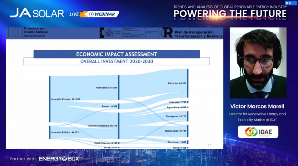 之后,西班牙能源局(IDAE)的可再生能源和电力市场负责人Victor Marcos Morell以“西班牙的可再生能源、氢能和海洋产业”为主题作演讲。他首先介绍了西班牙可再生能源趋势和规划工具的背景,重点介绍了欧盟能源计划的REpowerEU行动。他还提到了西班牙复苏和抗击疫情计划,包括212项措施:110项投资和102项改革。此外,Morell解释了RFI机会和西班牙的优势,强调西班牙近年来在可再生能源开发和价值链中取得了更高的地位。