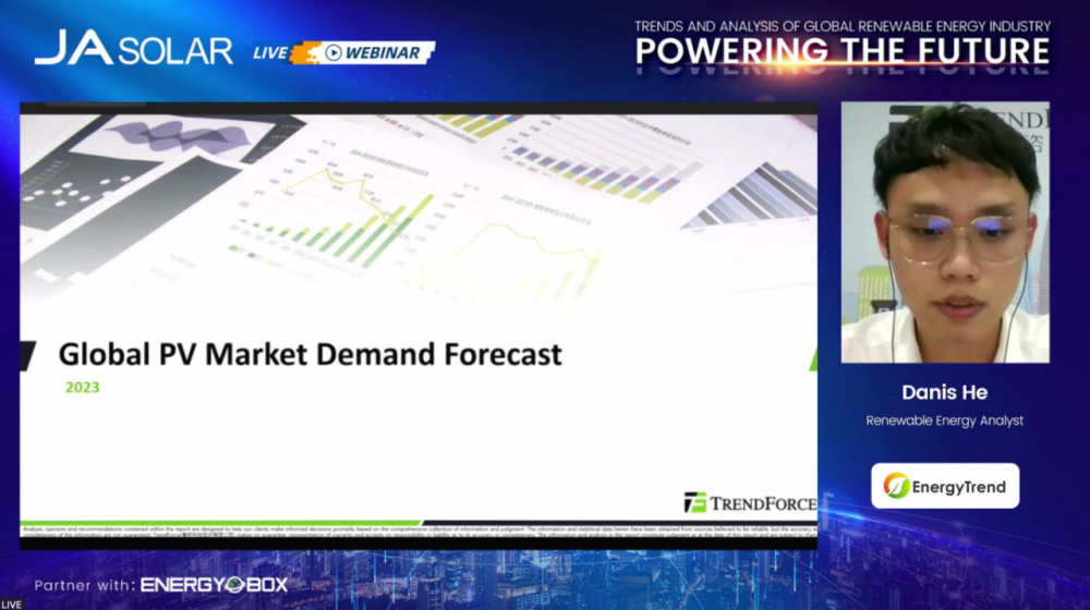 集邦咨询可再生能源分析师Danis He预计2023年全球光伏新增装机量将达到351GW,同比增长53.4%。对于亚太地区,他预计2023年光伏新增装机将同比增长55.36%,达到202.5GW,而中国的预计新增装机容量将达到约149GW。他还展示了德国、西班牙、荷兰、美国、巴西、中东北非地区、印度等不同国家和地区的光伏新增装机预测,并总结,全球光伏安装需求将实现高增长,光伏组件价格将恢复正常水平,供应链压力将得到缓解。