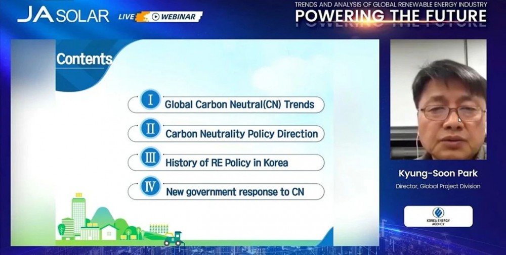 来自韩国能源部(Korea Energy Agency,KEA)全球项目部的主任Kyung-Soon Park以“碳中和与可再生能源”为重点作演讲。他的演讲主要包括全球碳中和趋势、碳中和政策方向、韩国可再生能源政策历史以及应对碳中和的新政府的响应。对于韩国而言,Park介绍了可再生能源政策的历史、国家计划的制定、国内可再生能源分配目标的变化以及现状。他进一步透露,自去年3月以来,新政府正在通过各种政策简报和国家推广计划,致力于实现核电与可再生能源的合理和谐。