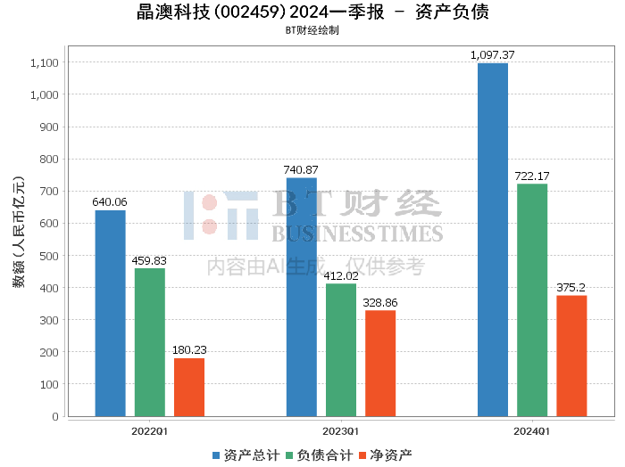 截至2024年3月31日,晶澳科技的资产总计为1097.37亿元,较期初的1065.89亿元增长了2.95%。负债合计为722.17亿元,较期初的685.85亿元增长了5.29%。资产负债率从期初的64.35%上升至65.81%,显示出公司在扩展业务规模的同时,负债水平有所增加。