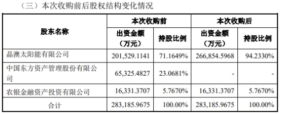 晶澳科技在公告中称,2022年公司实施市场化债转股引入投资人对标的公司进行增资,根据投资协议中退出安排的约定,本次交易是公司结合当前市场环境及未来经营规划,经与标的公司其他股东协商一致的结果,有利于增强对标的公司的控制权,符合公司发展战略和实际经营规划。本次交易不会导致公司合并报表范围发生变化,不会对公司财务状况和经营成果产生重大影响。