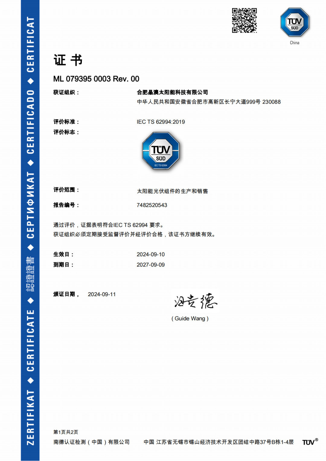 TüV南德经过对晶澳科技组件生产制造、使用、回收利用、报废处理和环境健康安全风险等全流程的专业系统性评估,确定晶澳科技符合“IEC TS 62994:2019”规范要求。