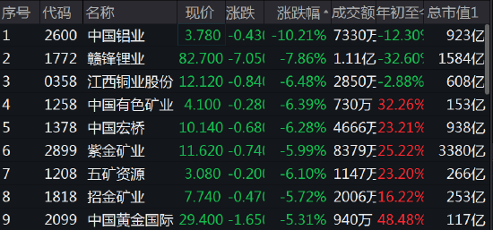 有色股普跌,中国铝业跌超10%,赣锋锂业跌近8%