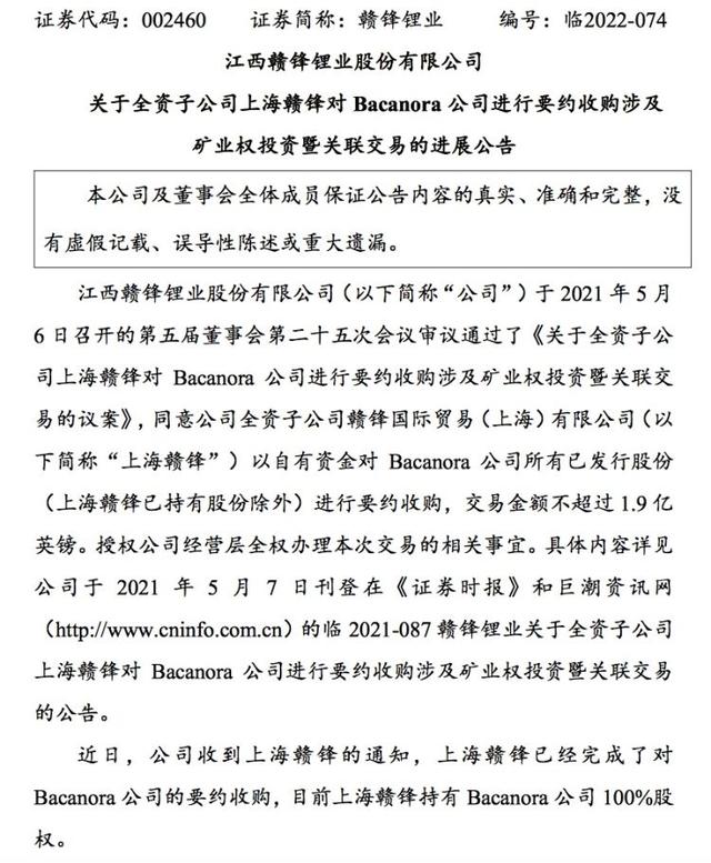 赣锋锂业8日晚间公告,上海赣锋已经完成了对 Bacanora 公司的要约收购,交易金额不超过1.9亿英磅(约合人民币15.5亿元)。目前上海赣锋持有 Bacanora 公司 100%股权。