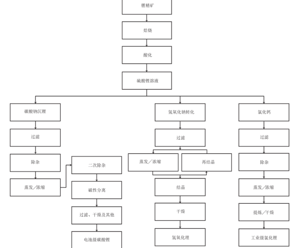 根据赣锋锂业和天齐锂业两家公司的2022年年报,两家公司的方法基本类似:对锂精矿进行高温煅烧,使α型锂辉石转变为β型锂辉石,磨细,加入硫酸酸化。反应结束后加入适量的水浸出硫酸锂,经过除杂、浓缩得到完成液,与纯碱反应生成碳酸锂。再经过除磁、搅拌、烘干得到电池级碳酸锂。