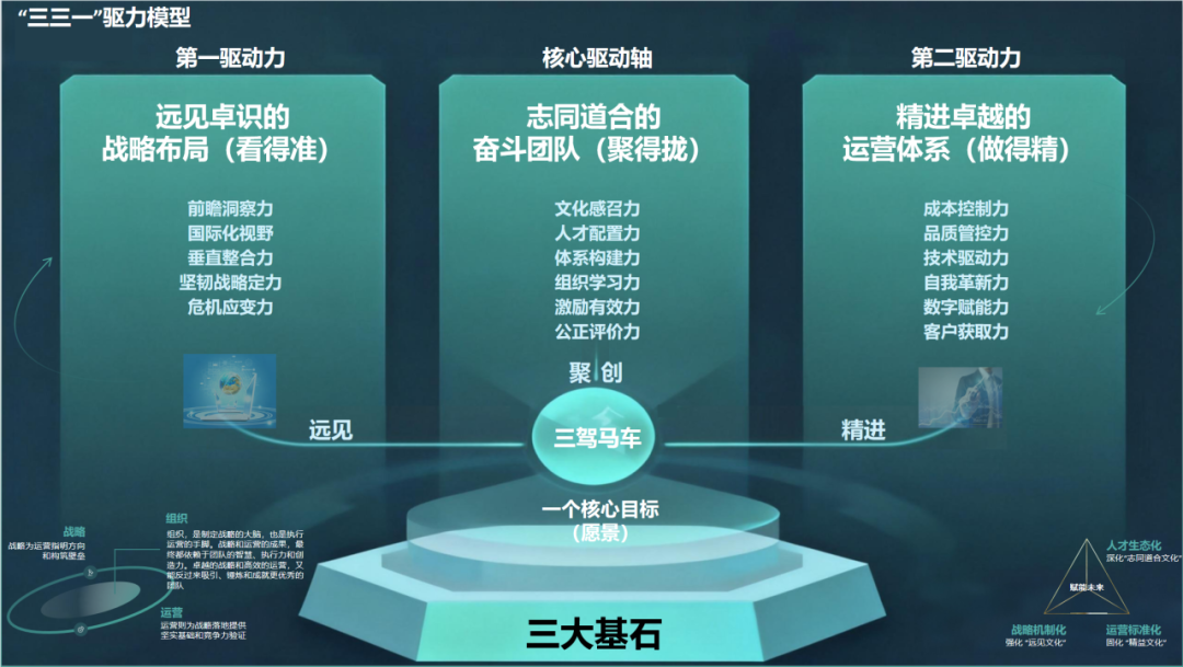 其中,“远见”是战略层面对外部复杂性的映射与预判能力;“精进”是运营层面将内部资源与技术转化为极致效率与品质;“聚创”则是聚才与共创,是组织层面维持系统不断迭代、吸引并激发人才内驱力的核心动能。