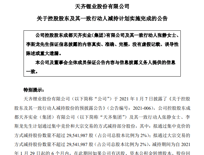 截至2021年7月29日,天齐集团及其一致行动人张静女士、李斯龙的股份减持计划已实施完毕。