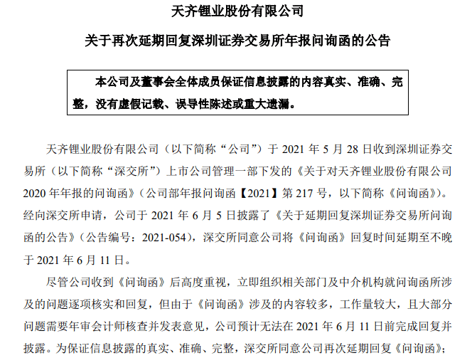 6月14日,天齐锂业一则《关于再次延期回复深圳证券交易所年报问询函的公告》让其股价在隔天大跌9%。至于天齐锂业为何无法及时回复年报问询,就不得不提到其此前因收购锂矿公司导致的债务问题。