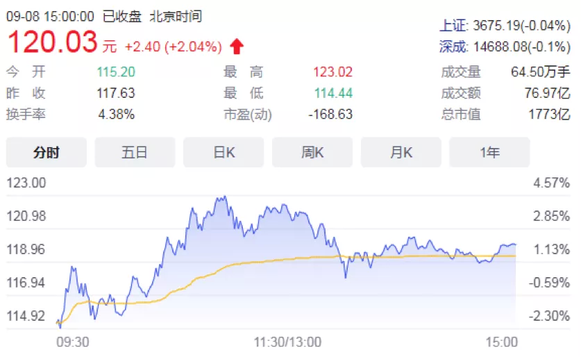 截止9月8日下午收盘,天齐锂业的股价报收于120.03元,公司总市值为1773亿元。