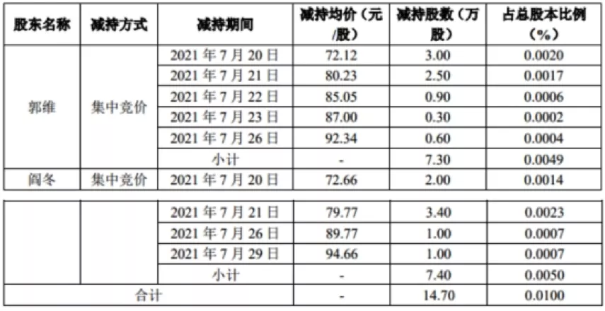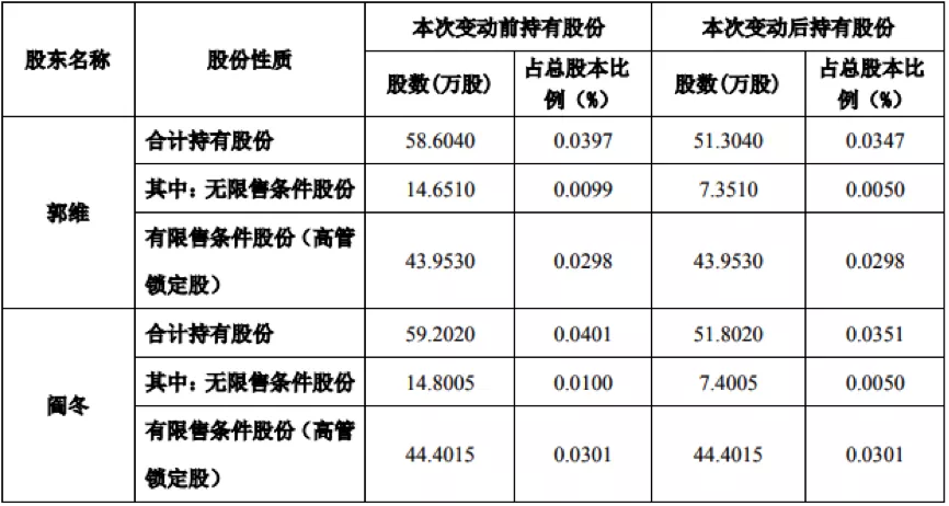 公告显示,截至公告日,郭维和阎冬的减持计划时间已过半,其中郭维累计减持7.30万股,占总股本比例0.0049%,阎冬累计减持7.40万股,占总股本比例0.0050%,二人合计减持14.70万股,占总股本比例0.01%。