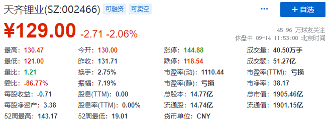 截至午间收市,天齐锂业(002466.SZ)收报 129.00元,目前总市值1,905.46亿元人民币。